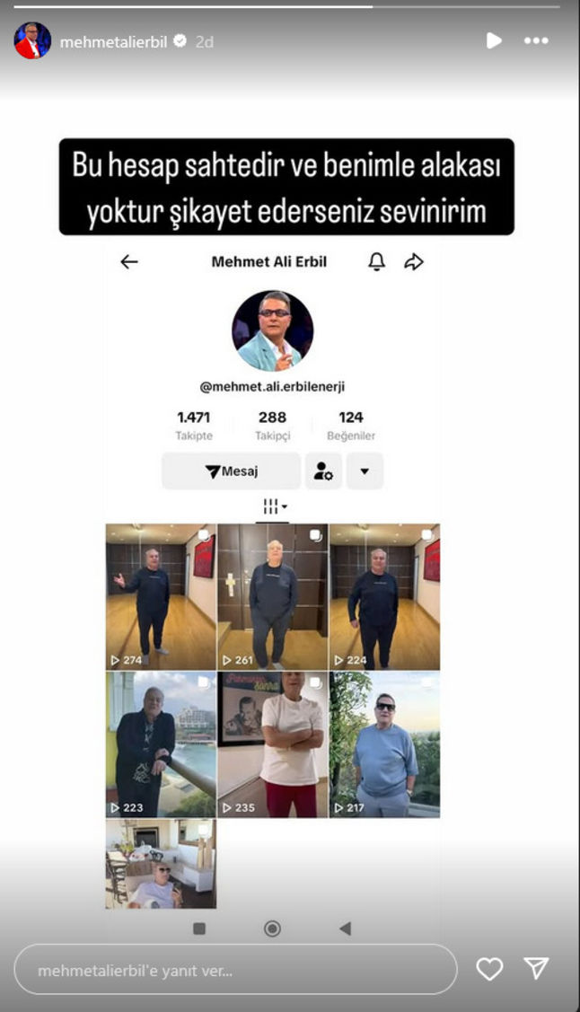 Sıkı bir sosyal medya kullanıcısı olan Mehmet Ali Erbil'in adına sahte bir TikTok hesabı açıldı.